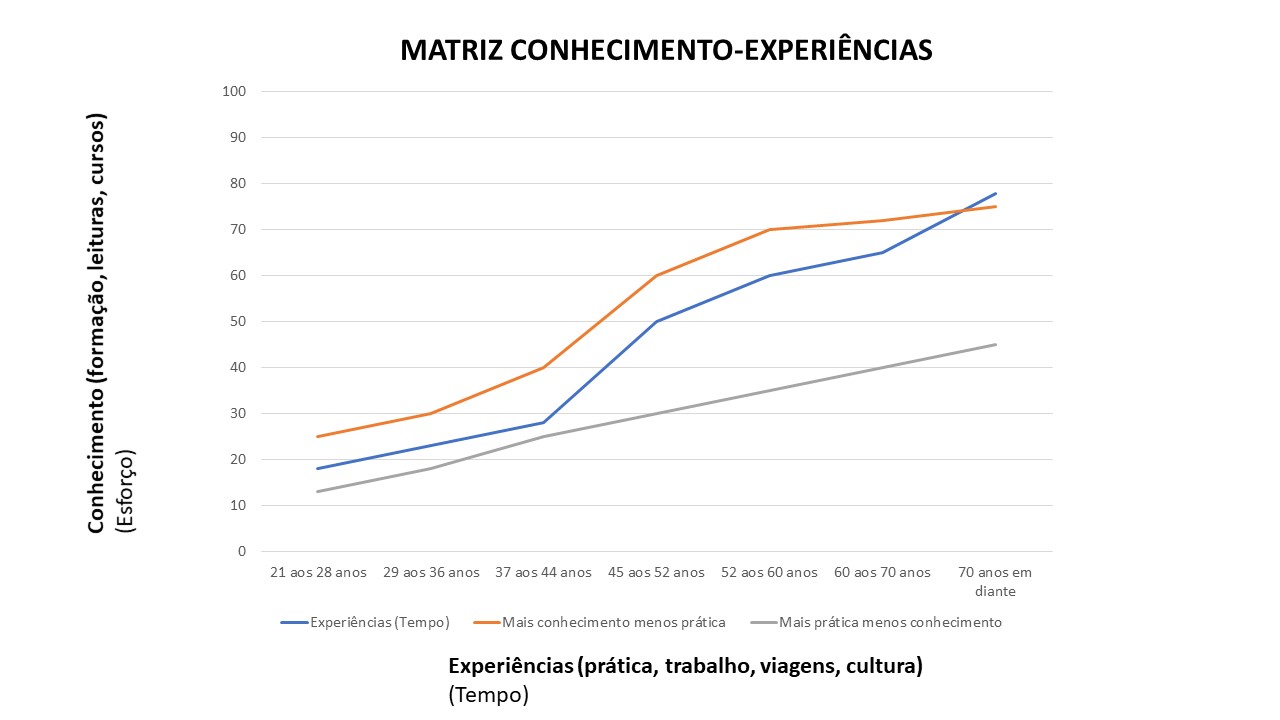 Para ilustrar isto tudo criei a matriz abaixo que ilustra 3 linhas de evolução da relação Conhecimento x Experiência.